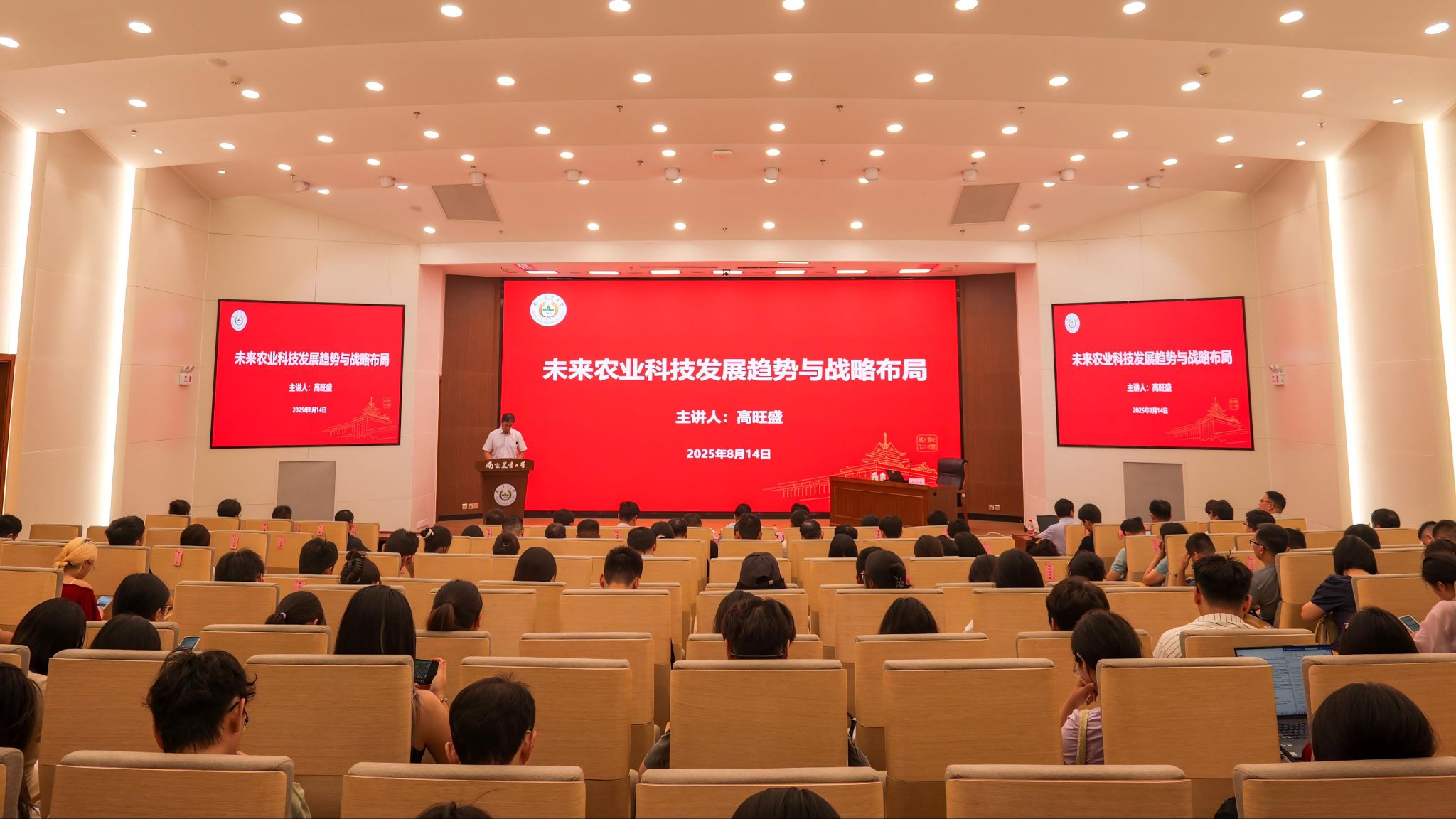 为精准把握国内外农业科技发展现状和未来发展趋势,8月14日,中国农业大学国家农业科技战略研究院院长、国家农业科技战略智库联盟执行理事长高旺盛教授应邀为我校作题为“未来农业科技发展趋势与战略布局”的专题报告。校党委常委、副校长王源超、朱艳出席报告会,各学院、各单位负责人及师生代表共200余人参加了报告会。报告会由王源超主持。