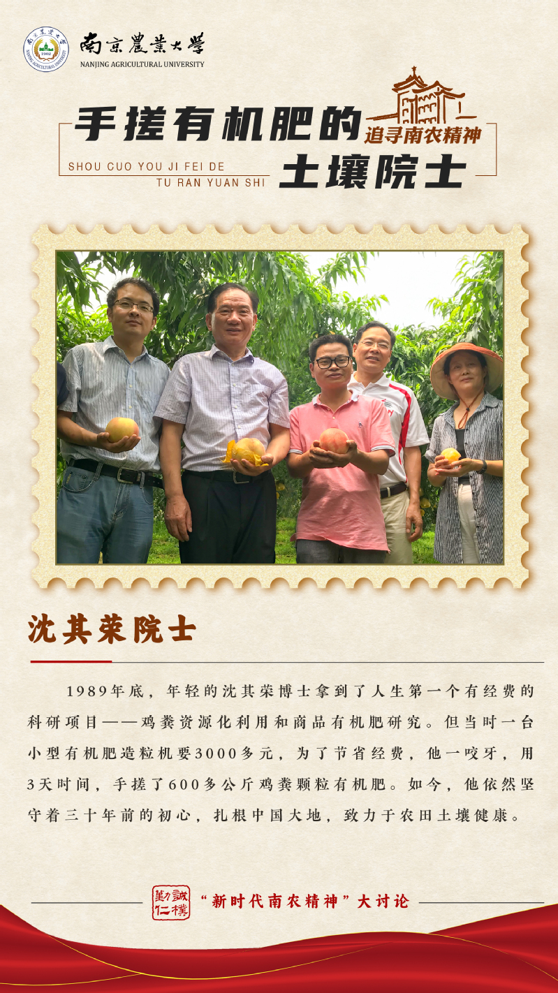 1989年底,年轻的沈其荣博士拿到了人生第一个有经费的科研项目——鸡粪资源化利用和商品有机肥研究。当时一台小型有机肥造粒机要3000多元,为了节省经费,他一咬牙,用3天时间,手搓了600多公斤鸡粪颗粒有机肥。如今,他依然坚守着三十年前的初心,扎根中国大地,致力于农田土壤健康。
